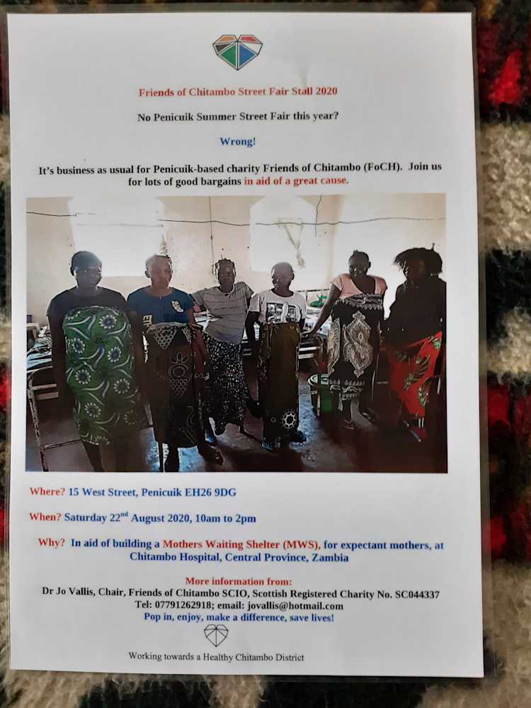 If you're anywhere near Penicuik, Scotland please support our Street Fair stall on Saturday 22nd August, 10 am to 2pm at 15 West St, PENICUIK. MIDLOTHIAN EH26 9DG. SCOTLAND (In the garden, with all appropriate social distancing/PPE): https://drive.google.com/file/d/18pB9_n4Y_3xJHZBtDLWJFivd5TPIPTsS/view?usp=drivesdk Penicuik-based charity, Friends of Chitambo SCIO (Scottish Registered Charity No. SC044337) is fundraising for a Mothers Waiting Shelter for expectant mothers at Chitambo Hospital, Central Province, Zambia. We will be offering: